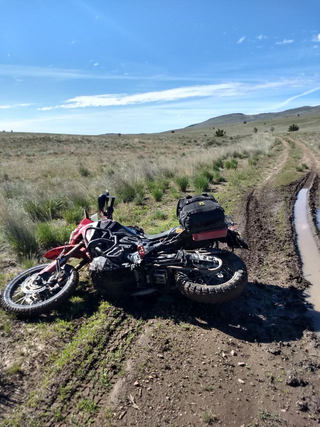 The Twin earned full flight status on this run. Such a crazy capable machine that happily hammers on and on and on. The Owyhee country is so damn rugged, the “road” was basically scab rocks and waterholes with a little less vegetation than the non road bits. Only had one serious crossing which I videoed, but I’m not paying for premium just to upload it. Not till my crush of fans demand it! Think I’ll be safe on that one. I did eat shit a couple times, once in baby-head rocks trying to get to an off-road camp spot without tons of cow shit and this time in a mud hole: