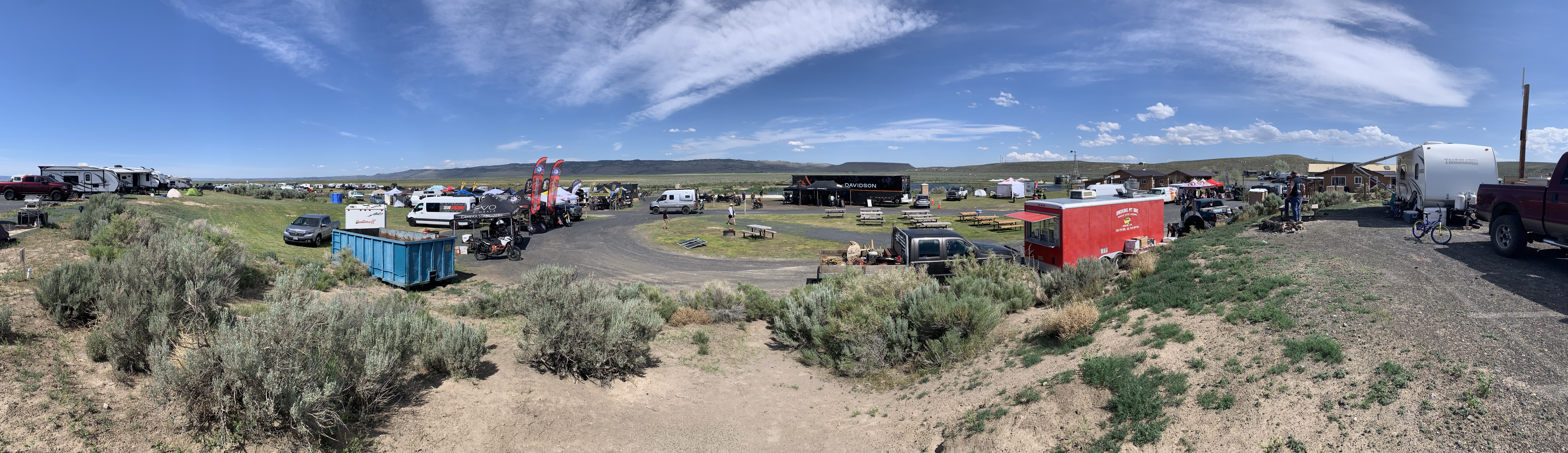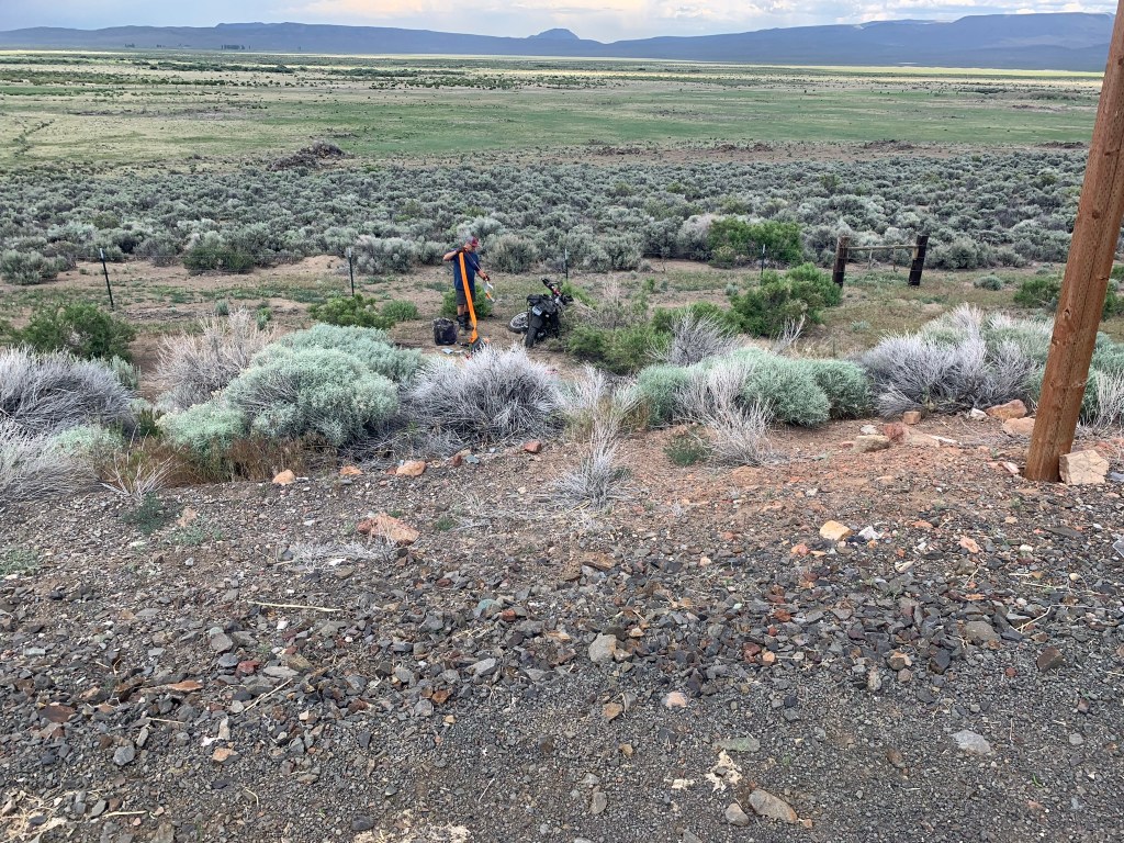 Figured I’d still go to the 10th Annual Giant Loop Ride at Crystal Crane Hotsprings anyway, bike or no. Camped out at Hart Mt. Wednesday and got a flat on the way out Thursday A.M. A fellow with a moto strapped on the back stopped to ask if I was good and I noticed a Smokejumper in his sleeve tattoo. Turns out we worked in the same area at the same time and knew a lot of the same folks, love that stuff! He was headed to the GL event as well and we made plans to meet up and BS.