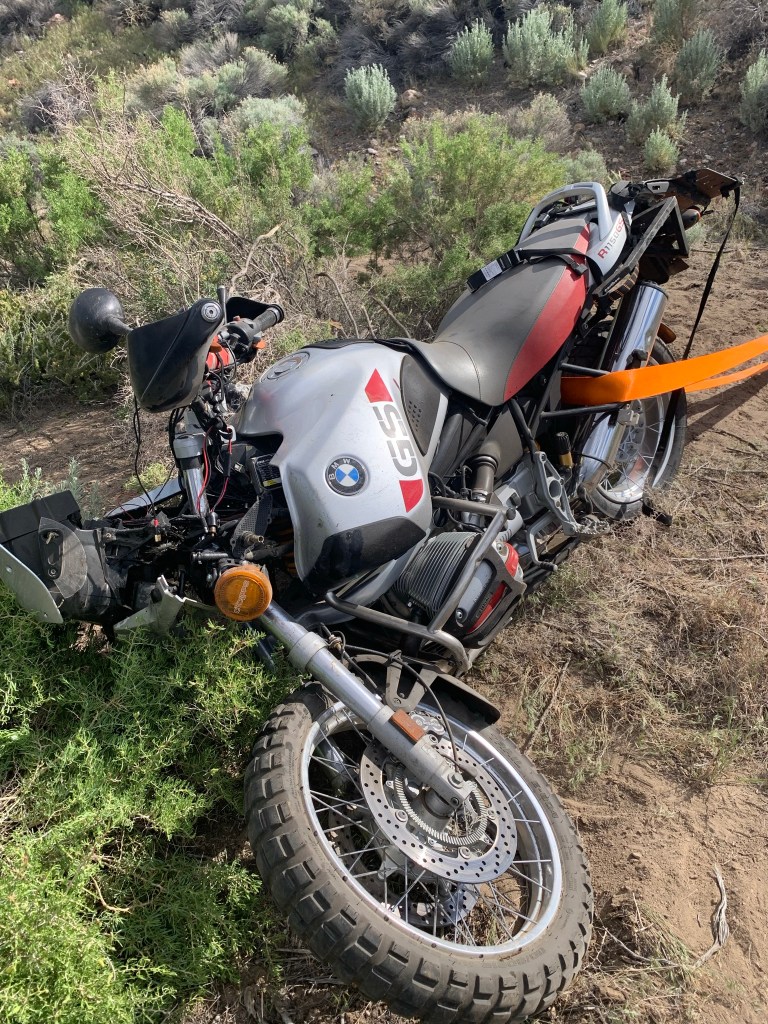 Not having had a burger from Fields Station in over a year, it was the next stop on the list. Saw another guy with a bike on a trailer there and went to chat and see if he was Giant Looping as well. He planned to, but a friend of his had just wrecked his 1150 GS 12 miles south of Fields and was ready to go recover it after the medics showed up to take his buddy to the hospital. I patched the rider up a bit as I always carry a big EMS kit with me and have the skills being a former Intermediate EMT. Offered to help recover the bike and was taken up on the offer so off we went…