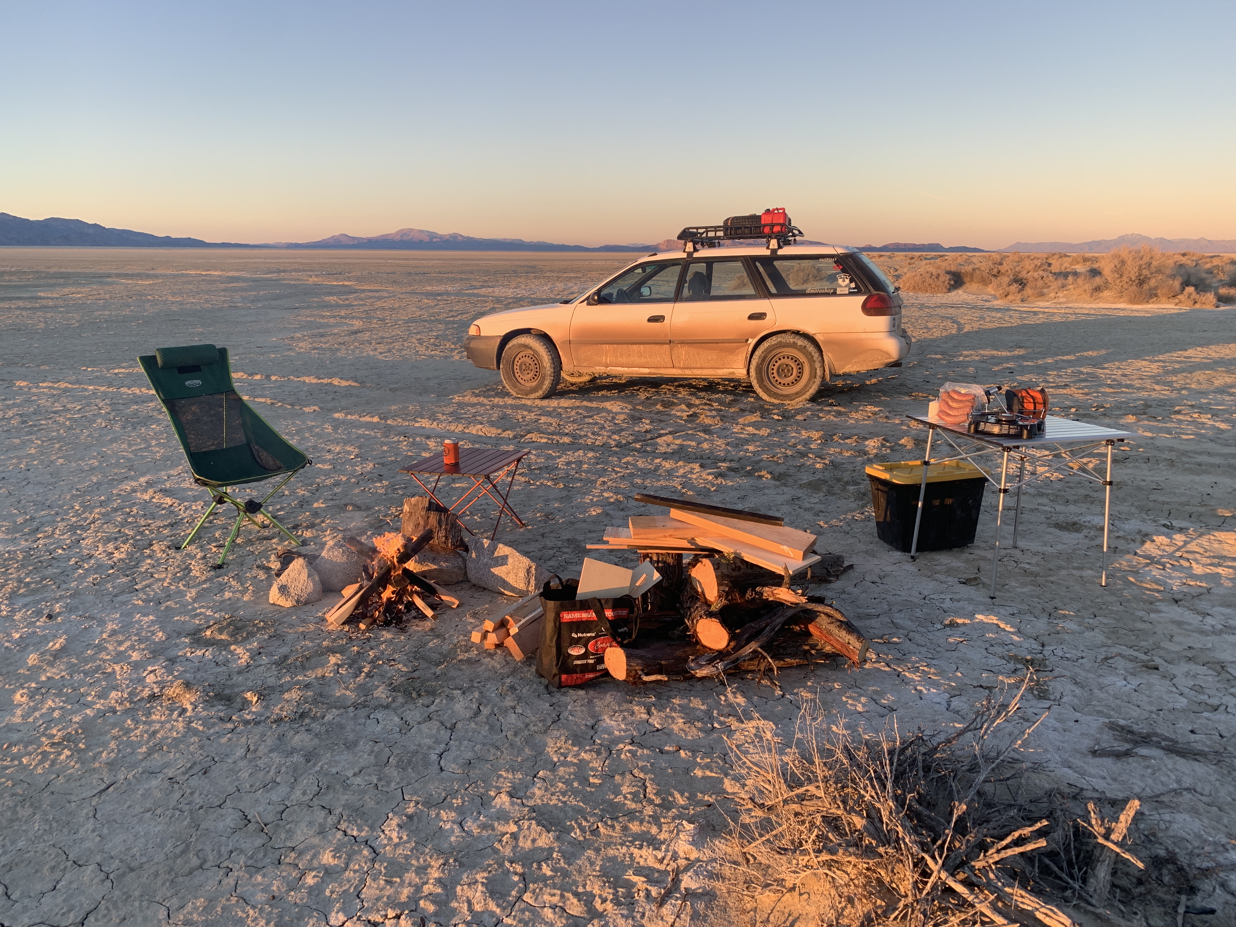 I had a bunch of wood scraps for a fire, but not a lot. On the run out through the Modoc I happened upon a juniper someone had cut up for firewood. They left a bunch of 2ish foot long limbs and a few rounds that I hucked in the back for a big bitching bonfire. The springs had a few folks at them on a late Sunday afternoon, so I set up camp on the playa and went back a couple hours later and had them all to myself while staring at the stars. Finestkind!
